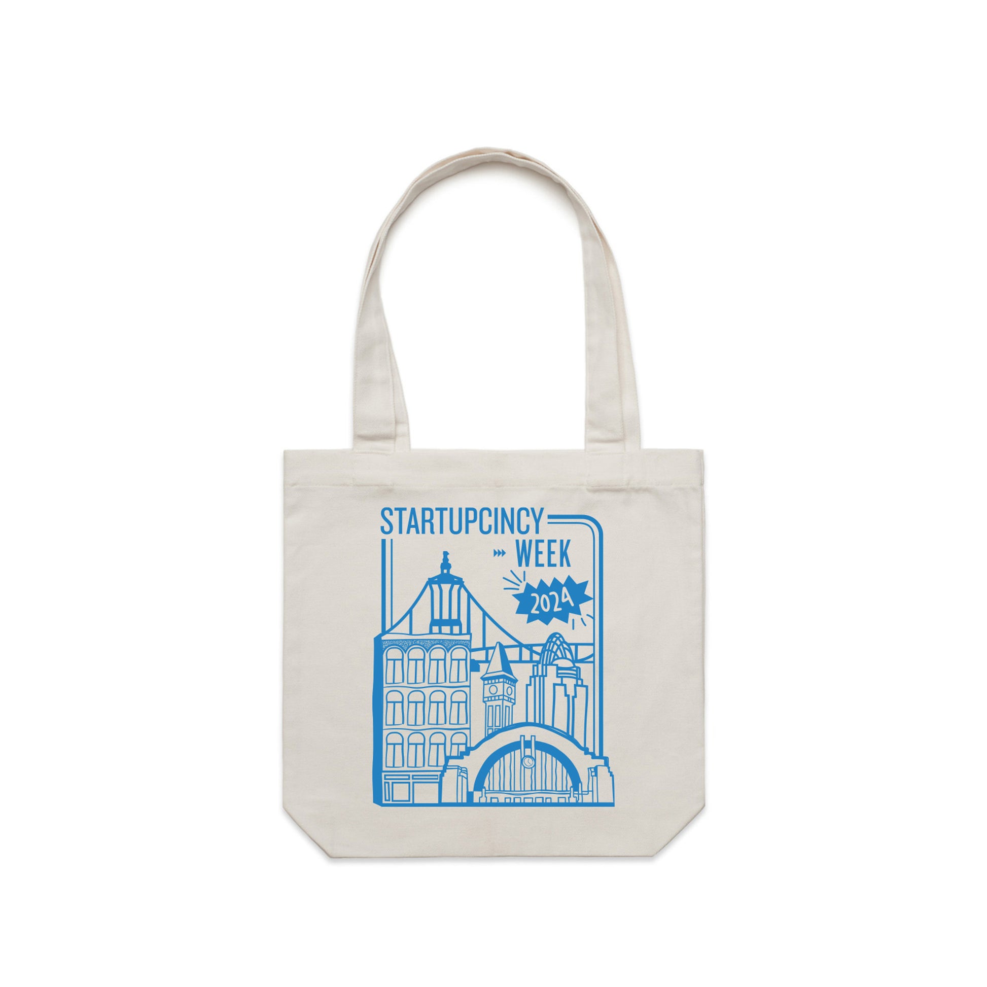 These durable cotton canvas tote bags feature the StartupCincy Week 2024 artwork expertly screen printed on one side.
